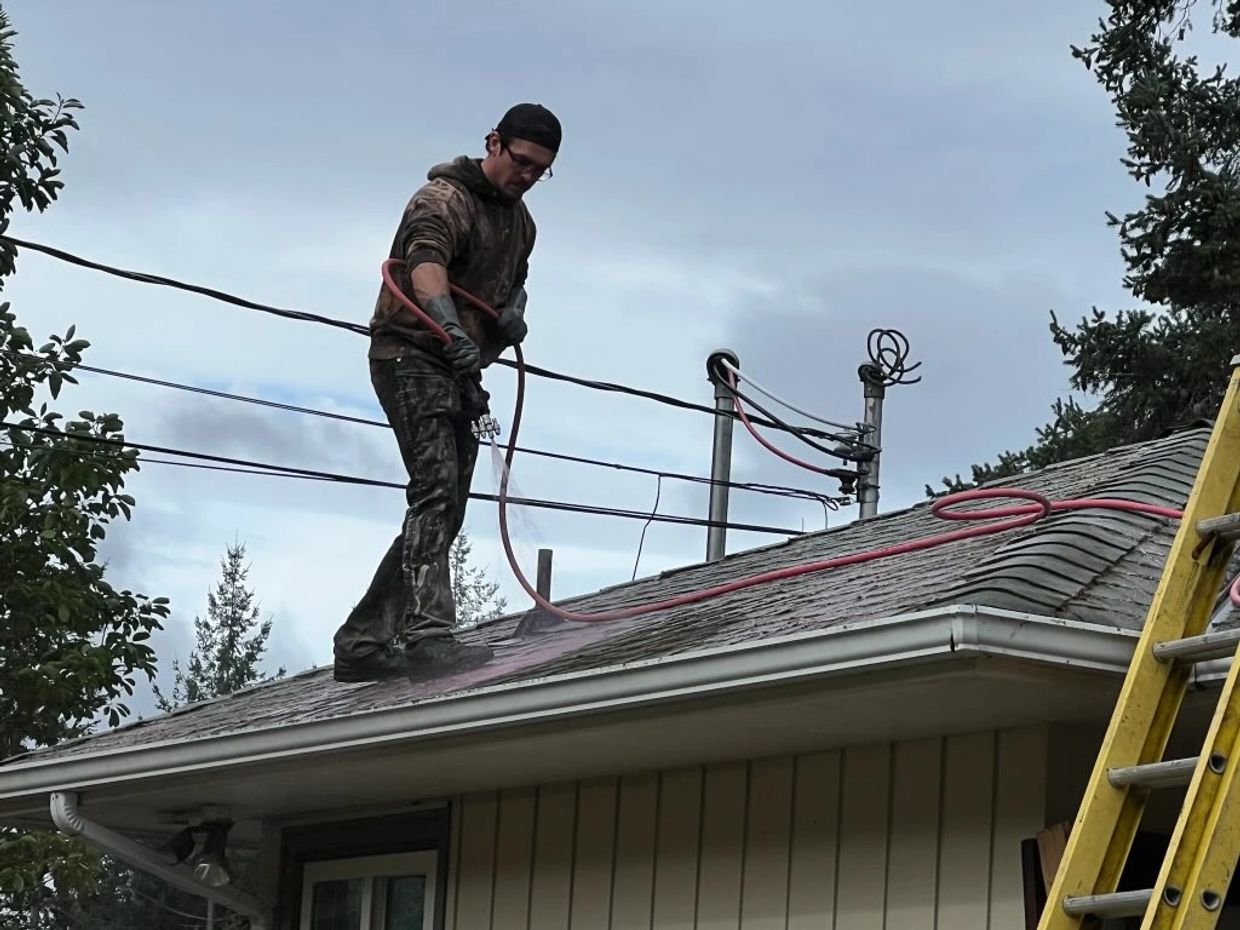 If your asphalt shingle roof is covered in moss, lichen, or dark algae streaks, it’s more than just an eyesore — it’s a threat to your roof’s lifespan. Our professional softwash roof treatment is the safest and most effective way to restore your roof without causing damage.